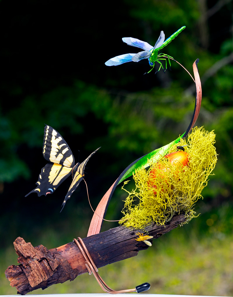 Its signature detail is the bird feather along the top of the body, secured with synthetic spider-web thread, to help shape the body, add fine detail and texture, as well as evoke a sense of a butterfly's gentle nature, striking colors and graceful flight.