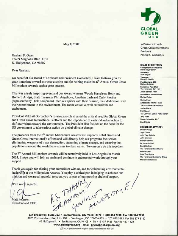 6th Annual Global Green and Green Cross Millennium Awards brings environmentalists together in Los Angeles on March 15th 2002. This dinner, attended by 400 VIP's, at the Ritz Carlton ballroom in Marina del Rey, featured a keynote speech from President Mikhail Gorbachev.