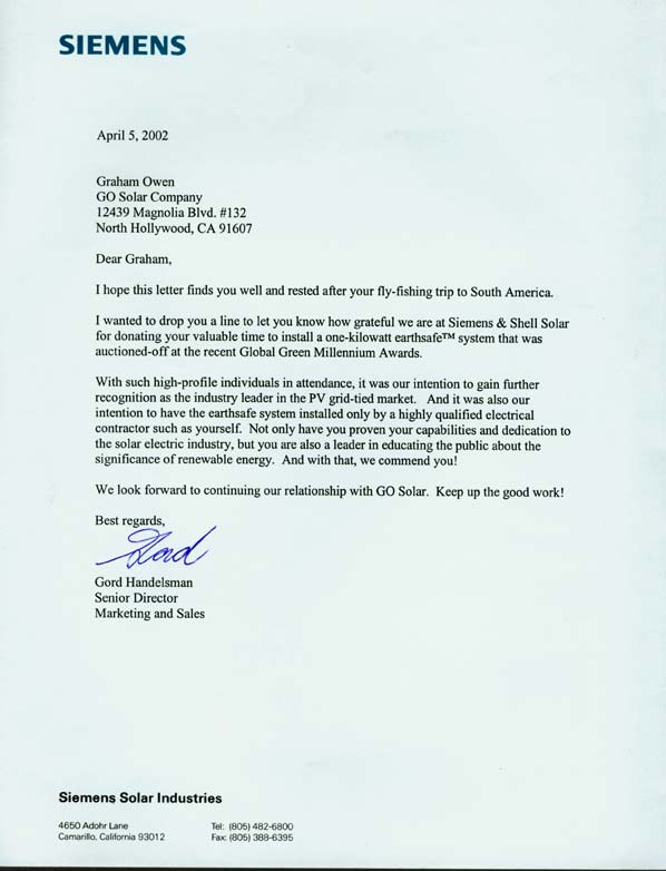 The event also featured a live auction sponsored by Siemens Solar, who donated a solar electric grid-tied system, including installation donated by Graham Owen, owner of GO Solar Company. This system, valued at $13,000, was purchased by actor Woody Harrelson for his Los Angeles home.